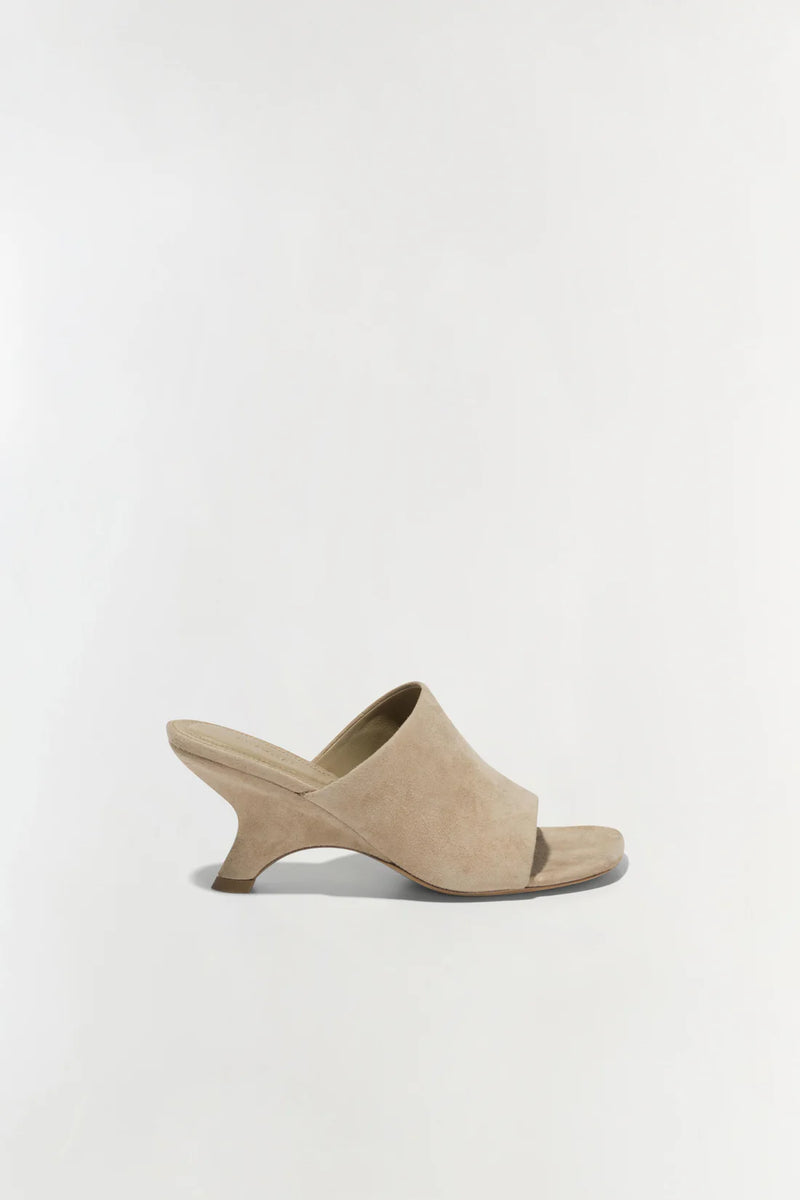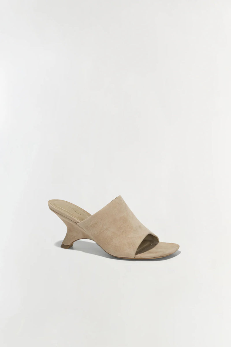 A mule sandal designed with a sculptural shape and built from fine leather for an aesthetic that is intentionally straightforward and compelling. Slip on.