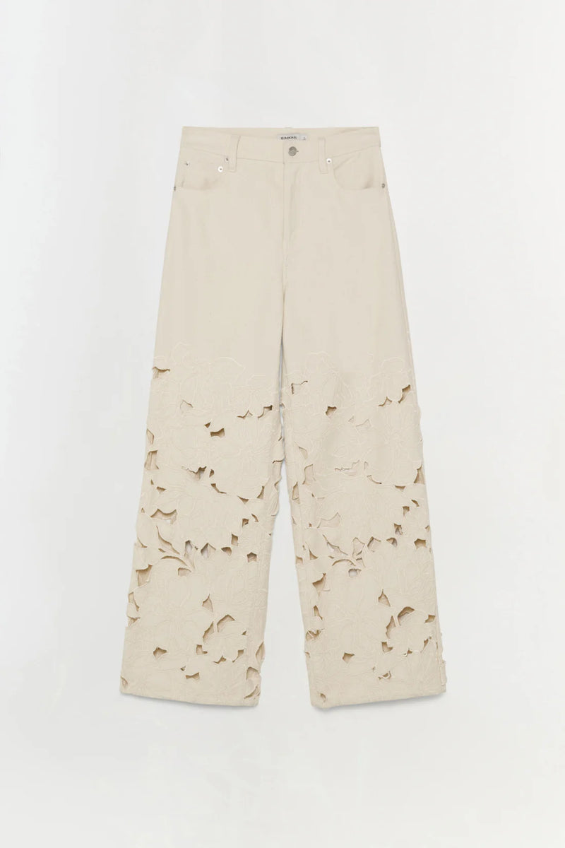 A straight leg jean that transitions into skillfully embroidered floral cut-outs down the length of the leg. Five pocket construction.