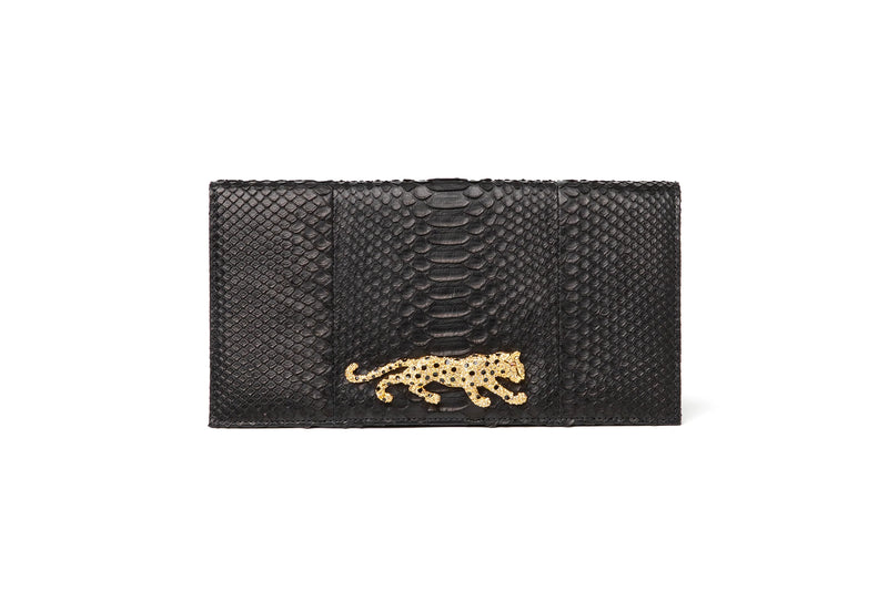 This python clutch is timeless and classic. It is sleek and beautiful and can be worn with jeans or with a cocktail dress. It comfortably fits a cell phone, lipstick, keys, and credit cards. The bag comes with a detachable chain shoulder strap measuring 25" (drop 17"). The gold plated leopard hardware is made with Swarovski Crystals. Each of our bags is lined with lavender suede and contains an inside pocket perfect for credit cards. This bag contains a magnetic closure.