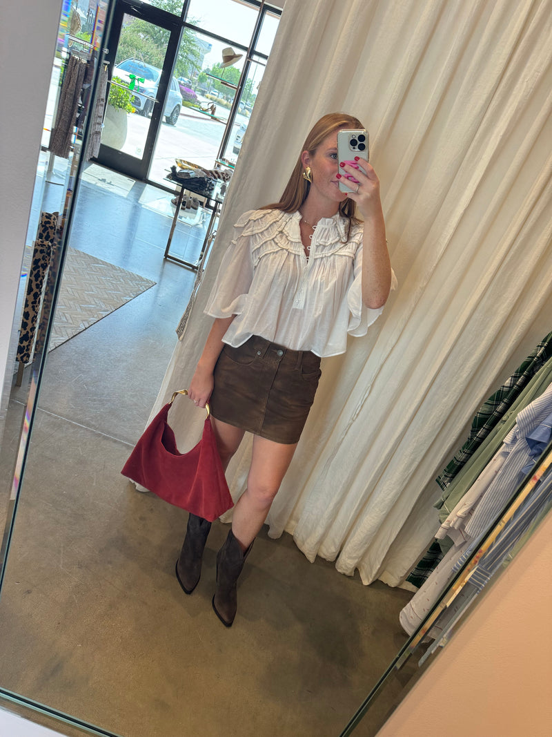 Effortlessly cool with a touch of Western-inspired edge. The Isabel Marant Kimmy Skirt in Tabacco features rich suede and classic details for an elevated everyday staple. Perfect for transitional dressing and layered looks.