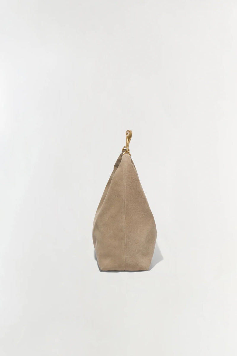A suede hobo bag in a relaxed shape with a complemented twisted metal top handle.